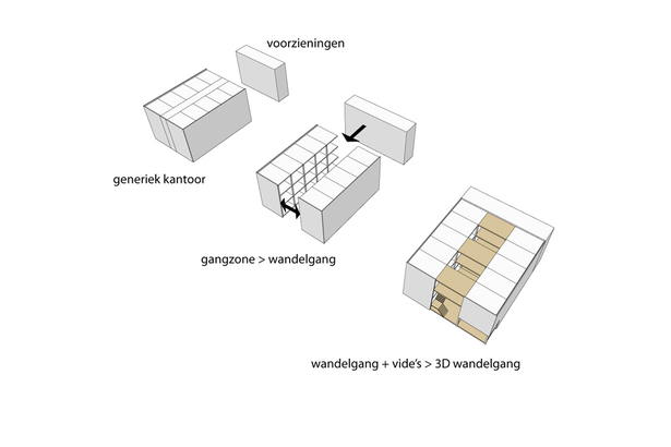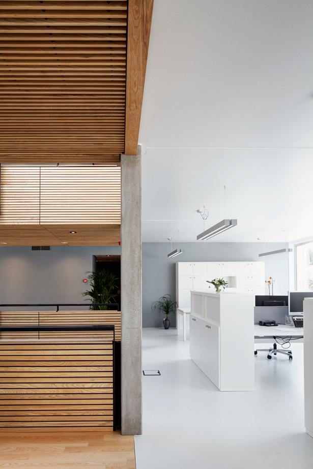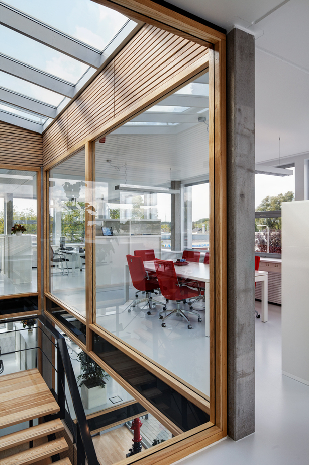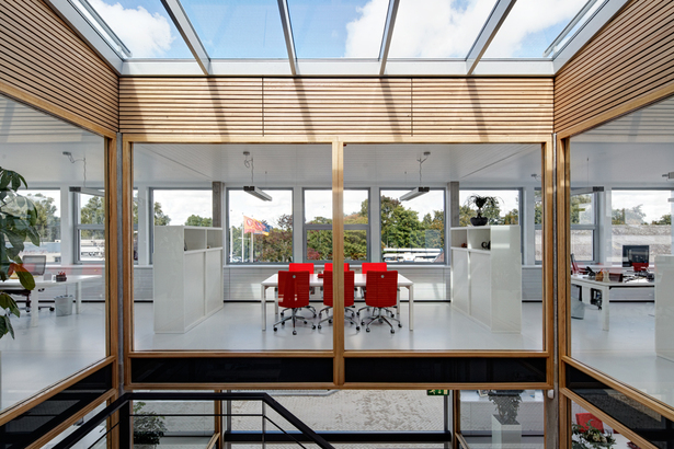 Especially for informal consultations and meetings the usual standard office hallway is transformed into a 3D walkway. This is an attractive area in which voids with stairs connect the three floors of the building spatially. The floors, the ceilings, the stairs, the office windows and parapets are all made of Ash. This creates a contrast between the formal and the informal atmosphere in the building.