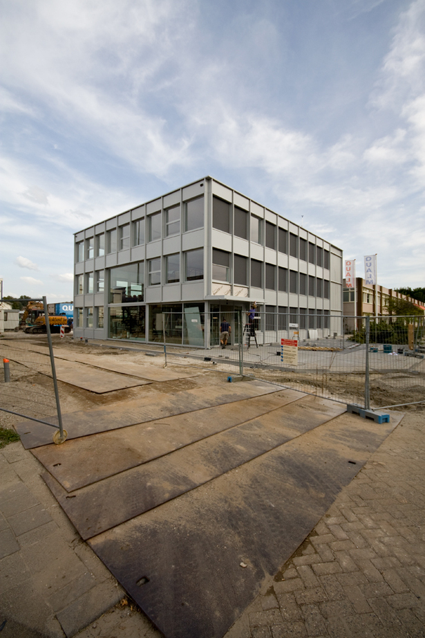 The building stands on the site where the company Qualm has long been established, in an industrial business park of the 1960s. The building fits in this robust context with a modestly designed façade. Behind the aluminum paneling an inventive, sustainable VRF air conditioning system is hidden. All piping and equipment are incorporated in the parapet, leaving no need for suspended ceilings in the offices.